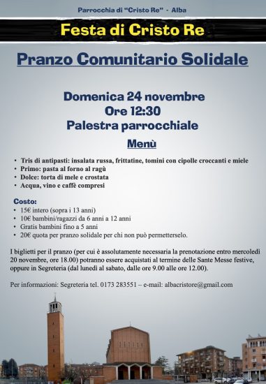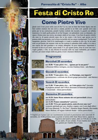 Clicca qui per visualizzare la lettera in formato PDF In occasione della Festa di Cristo Re viene diffuso un messaggio di speciale vicinanza ad anziani e ammalati. A tutti gli anziani ed ammalati della Parrocchia Carissima/o, Domenica 24 novembre celebreremo la festa di Cristo Re e ricorderemo il 66mo anno di vita della nostra parrocchia. Il tempo è passato e siamo invecchiati insieme. Ci hanno aiutato a vivere la Fede donPER SAPERNE DI PIU' →
