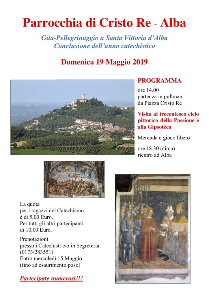 A conclusione dell’ anno catechistico è stata organizzata una Gita-Pellegrinaggio a Santa Vittoria d’Alba per la giornata di Domenica 19 Maggio 2019 dalle 14.00 alle 18.30.