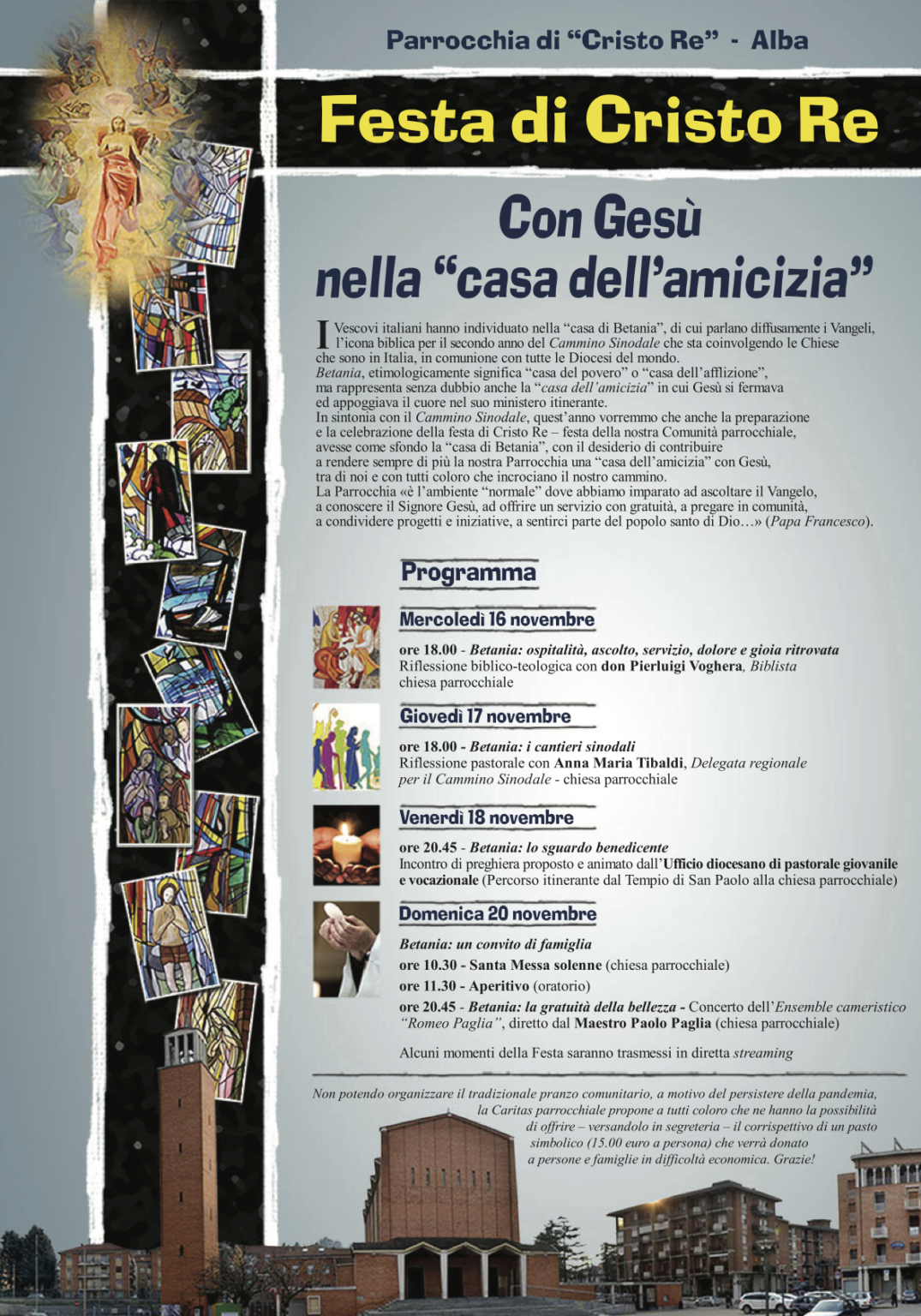 In sintonia con il Cammino Sinodale, quest’anno vorremmo che anche la preparazione e la celebrazione della festa di Cristo Re – festa della nostra Comunità parrocchiale, avesse come sfondo la “casa di Betania”, con il desiderio di contribuire a rendere sempre di più la nostra Parrocchia una “casa dell’amicizia” con Gesù, tra di noi e con tutti coloro che incrociano il nostro cammino.