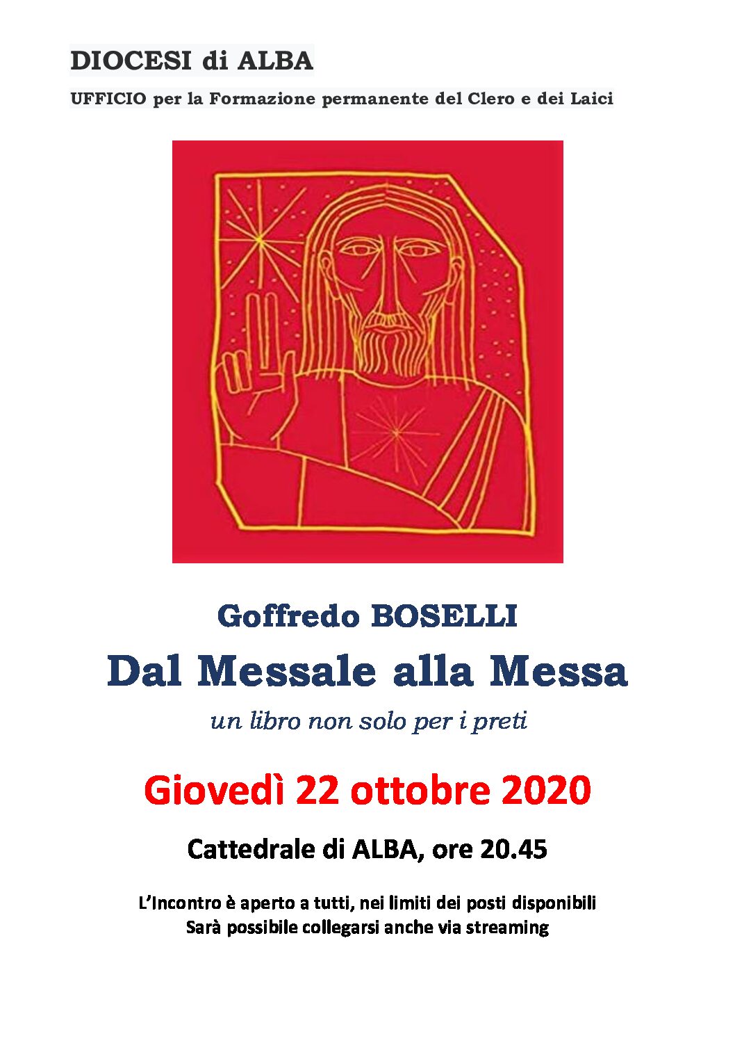 Giovedì 22 Ottobre, in Cattedrale ad Alba alle ore 20.45, si terrà l’Incontro diocesano di formazione per sacerdoti e laici con Goffredo Boselli, monaco di Bose, intitolato “Dal Messale alla Messa”.
